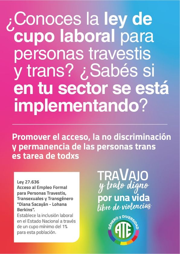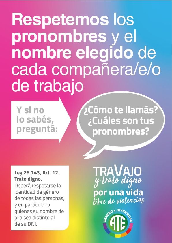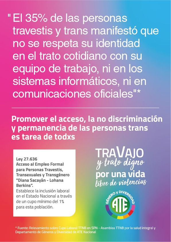 Este 28 de junio, Día del Orgullo LGBTIQ+, ATE como integrante de la Comisión Organizadora de la Marcha del Orgullo – Línea Histórica, acompañará la 8va Marcha Plurinacional Antirracista “Basta de Travesticidios, Transfemicidios y Transhomicidios”. En ese marco, además, presenta la Campaña “TraVajo y trato digno: Por una vida libre de violencias”, con afiches descargables para imprimir y pegar en cada sector de trabajo.