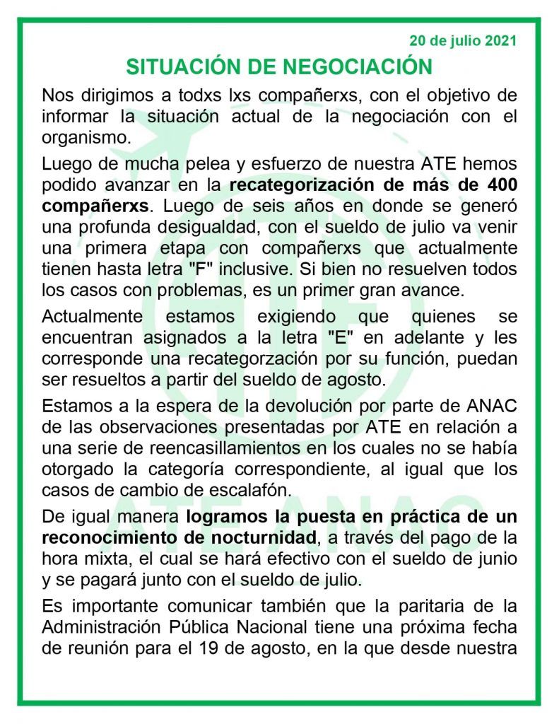 La Mesa Nacional de la ATE ANAC emitió un comunicado de prensa donde se informa la situación actual de la negociación con el organismo, que tienen como punto de partida el avance en las recategorización de más de 400 compañerxs.