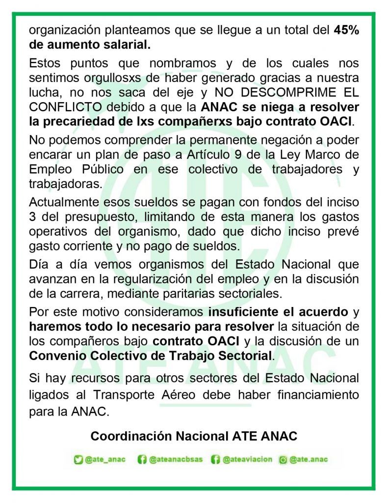 Para la ATE ANAC “estos puntos que nombramos y de los cuales nos sentimos orgullosxs de haber generado gracias a nuestra lucha, no nos saca del eje y no descomprime el conflicto debido a que la ANAC se niega a resolver la precariedad de Ixs compañerxs bajo contrato OACI”.