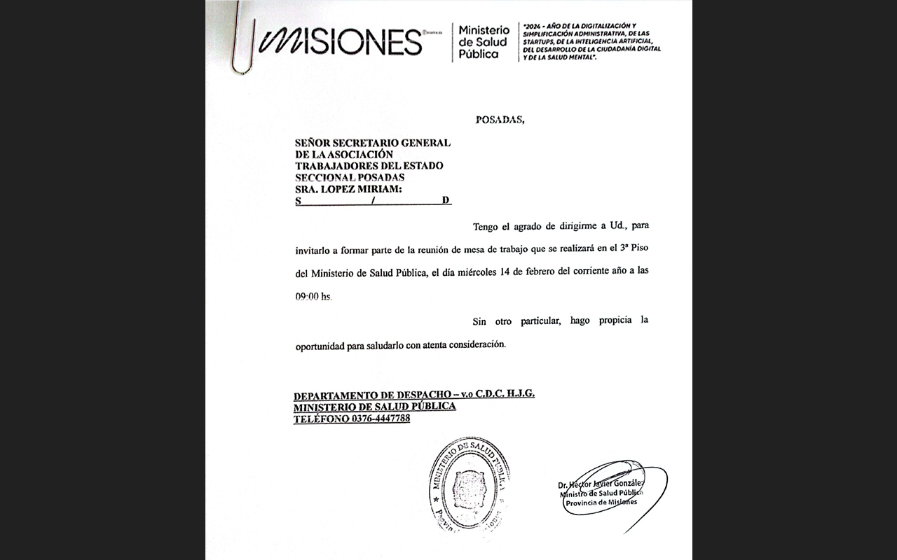 En la jornada del miércoles 7 de febrero, desde el Ministerio de Salud Pública y tras reiteradas solicitudes presentadas oportunamente por la organización sindical de Misiones, se formalizó la invitación para la participación de la 1° Mesa Técnica Sectorial año 2024, el día miércoles 14 de febrero del corriente a la hora 9:00 hs, donde ATE será recibida por el Ministro, Dr. Héctor Javier González.
