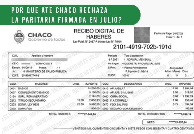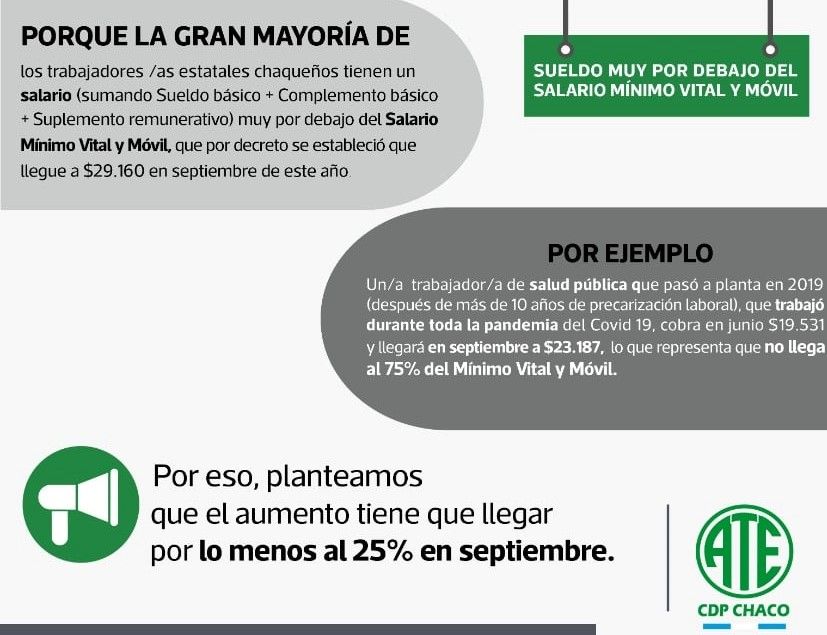La ATE Chaco reclamó que los salarios de las y los trabajadores del Estado provincial no sean menores al Salario Mínimo Vital y Móvil (SMVyM). Aún con el incremento cerrado tras las últimas paritarias, que el sindicato no aceptó, el sueldo básico de muchos de las y los agentes estatales no alcanzará esta cifra.