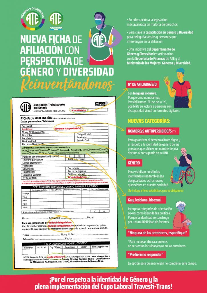 La Asociación de Trabajadores del Estado (ATE) presenta su nueva ficha de afiliación con perspectiva de Género y Diversidad en la que se permite la opción de incluir el nombre y género autopercibido, sin ser obligatoria la especificación en este último caso.