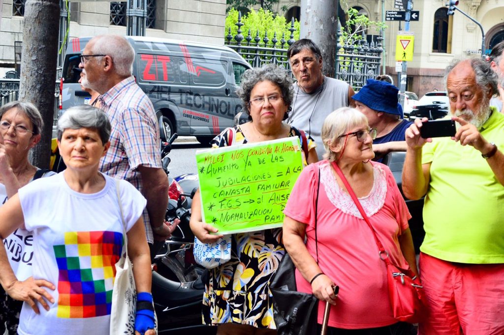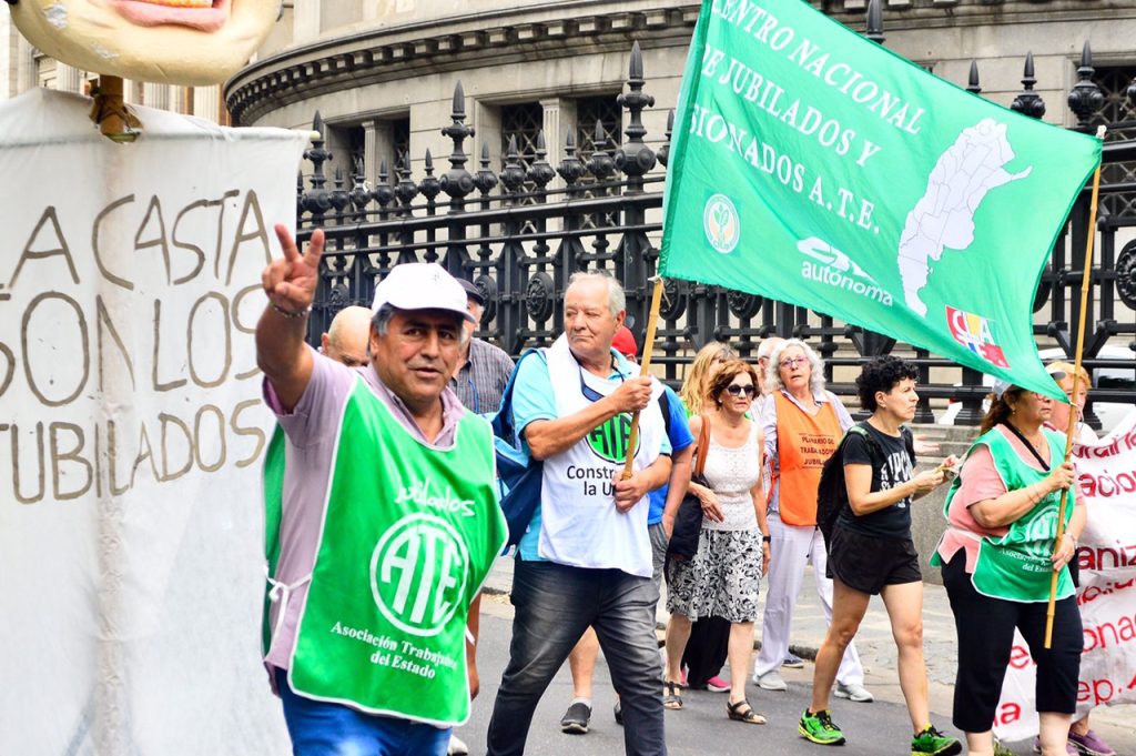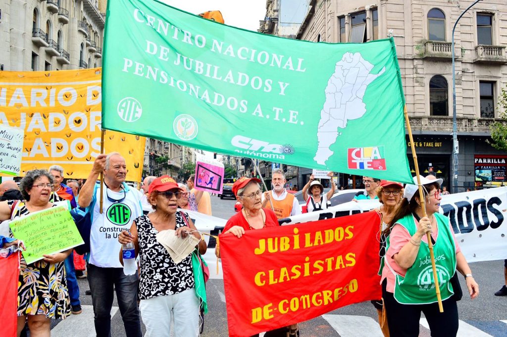 Continuando con el plan de lucha iniciado en defensa de sus derechos, en contra del DNU y la Ley de emergencia de Milei, las compañeras y los compañeros del Centro Nacional de Jubilados y Pensionados (CNJP) de la Asociación Trabajadores del Estado (ATE) se movilizaron hoy junto a otras agrupaciones de jubilados nucleadas en una Mesa Coordinadora Nacional. Movilizaron “porque las amenazas de ajuste siguen latentes, porque no hay nada en claro con respecto a la recomposición del salario de las y los jubilados, como tampoco se sabe qué sucederá con el Fondo de Garantía de Sustentabilidad”, y además para manifestar que “La canasta básica de de jubiladas y jubilados hoy es de 500.000 pesos”.