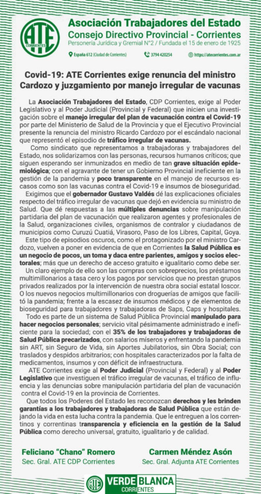 Para la ATE “este tipo de episodios oscuros, vuelven a poner en evidencia de que en Corrientes la Salud Pública es un ne...