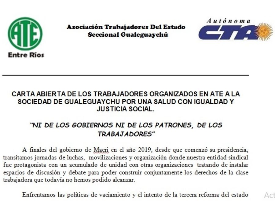 “Por una salud con igualdad y justicia social”, es el motivo de la misiva con un fuerte reclamo hacia el gobierno provin...