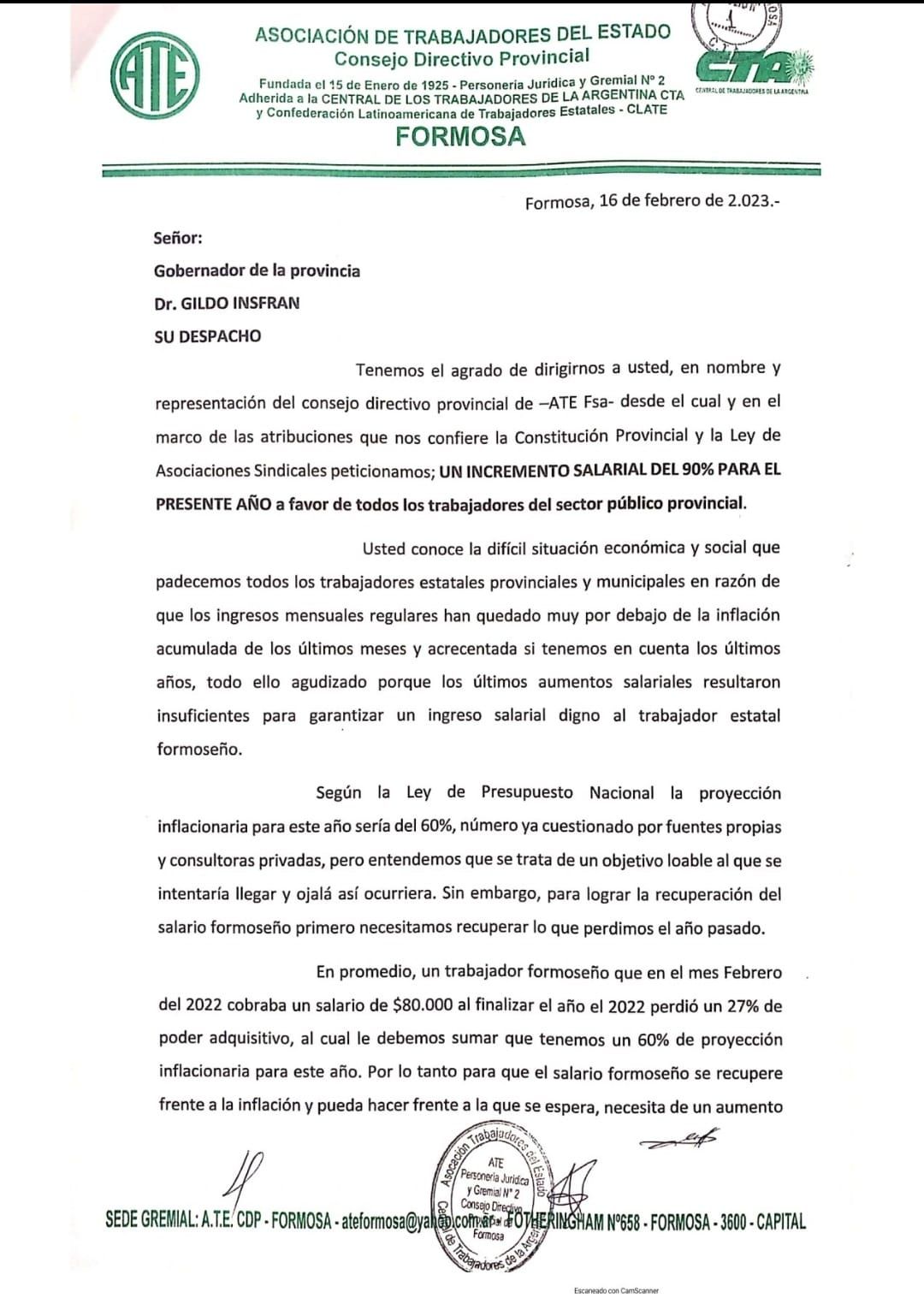 El pasado día viernes la ATE Formosa ingresó por la Mesa de Entrada de la Casa de Gobierno una nota pidiendo al gobernad...