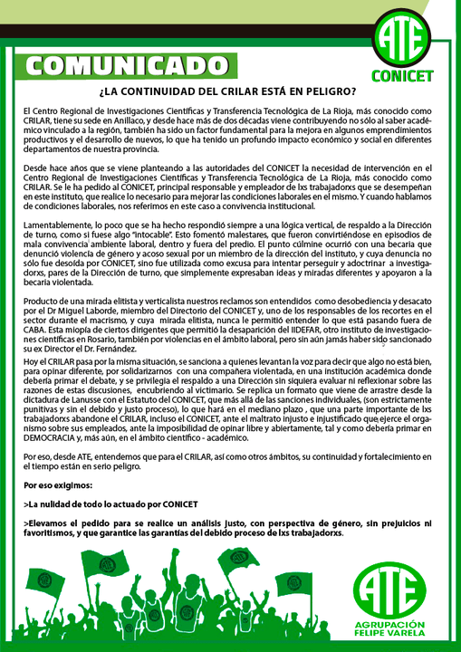 ATE exige la nulidad de todo lo actuado por el CONICET y pide que se realice un análisis justo, con perspectiva de géner...
