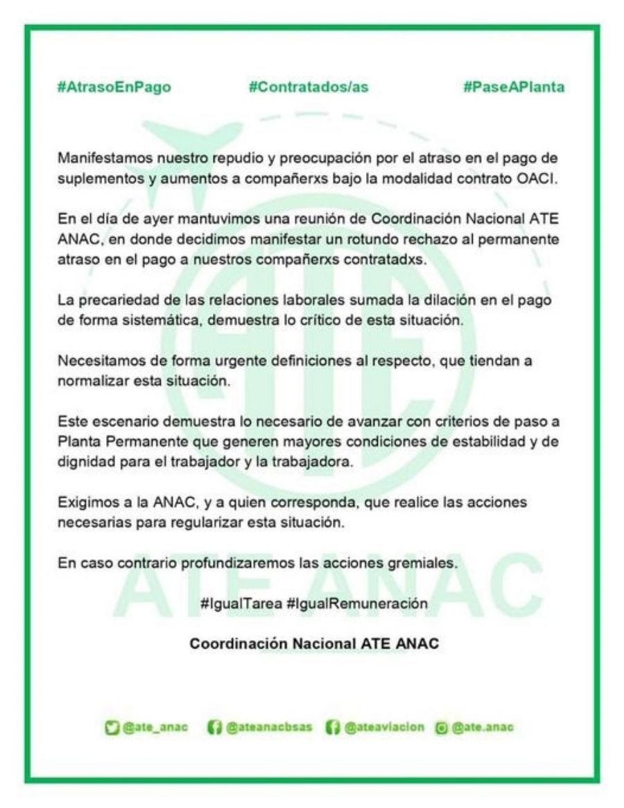 Se definió una medida de fuerza el 6 de noviembre, con caravana al Aeropuerto Ezeiza y posible afectación de servicios.