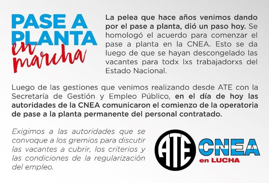 ATE exige a las autoridades que se convoque a discutir las vacantes a cubrir, los criterios y las condiciones de la regu...