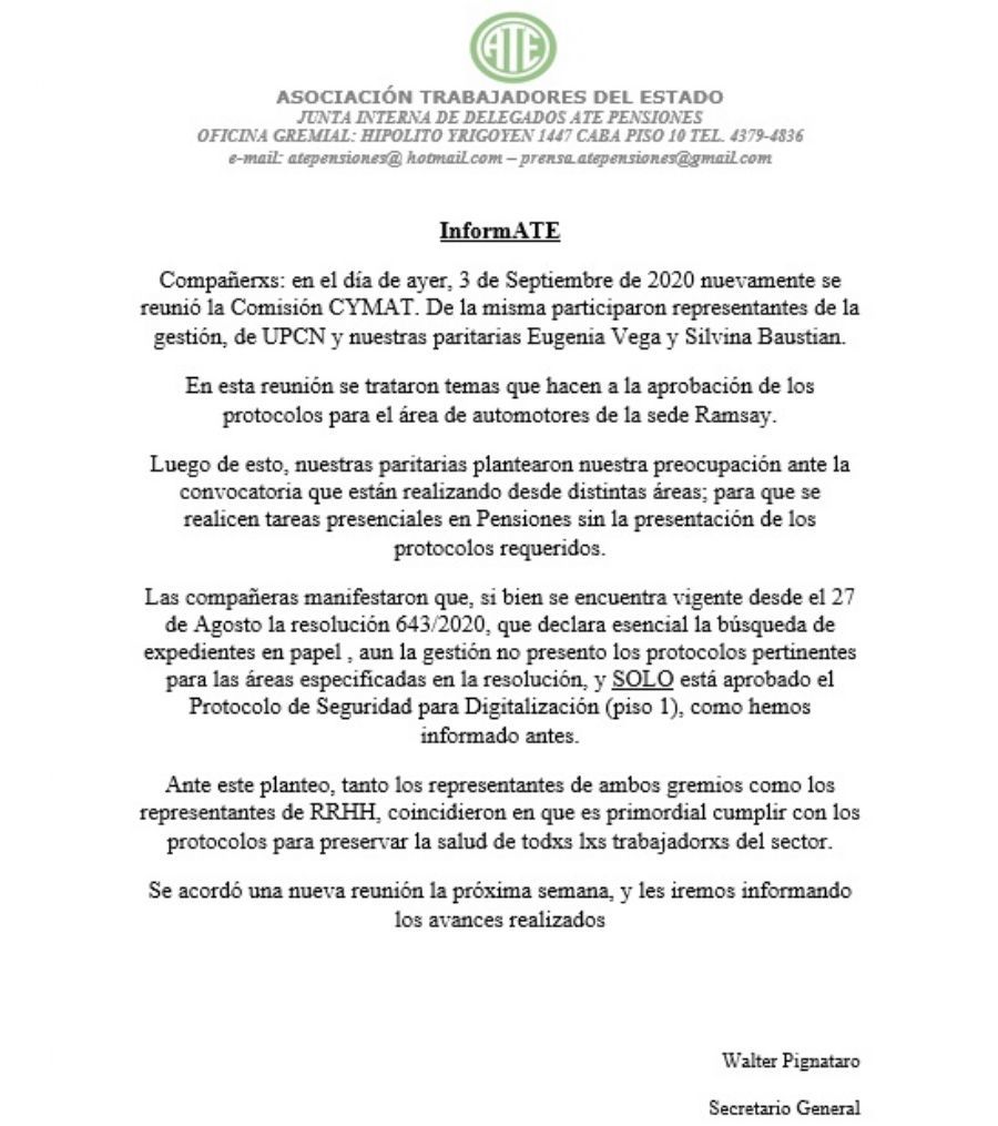 ATE pide celeridad para resolver la reactivación productiva, la reincorporación de los compañeros despedidos y la elabor...