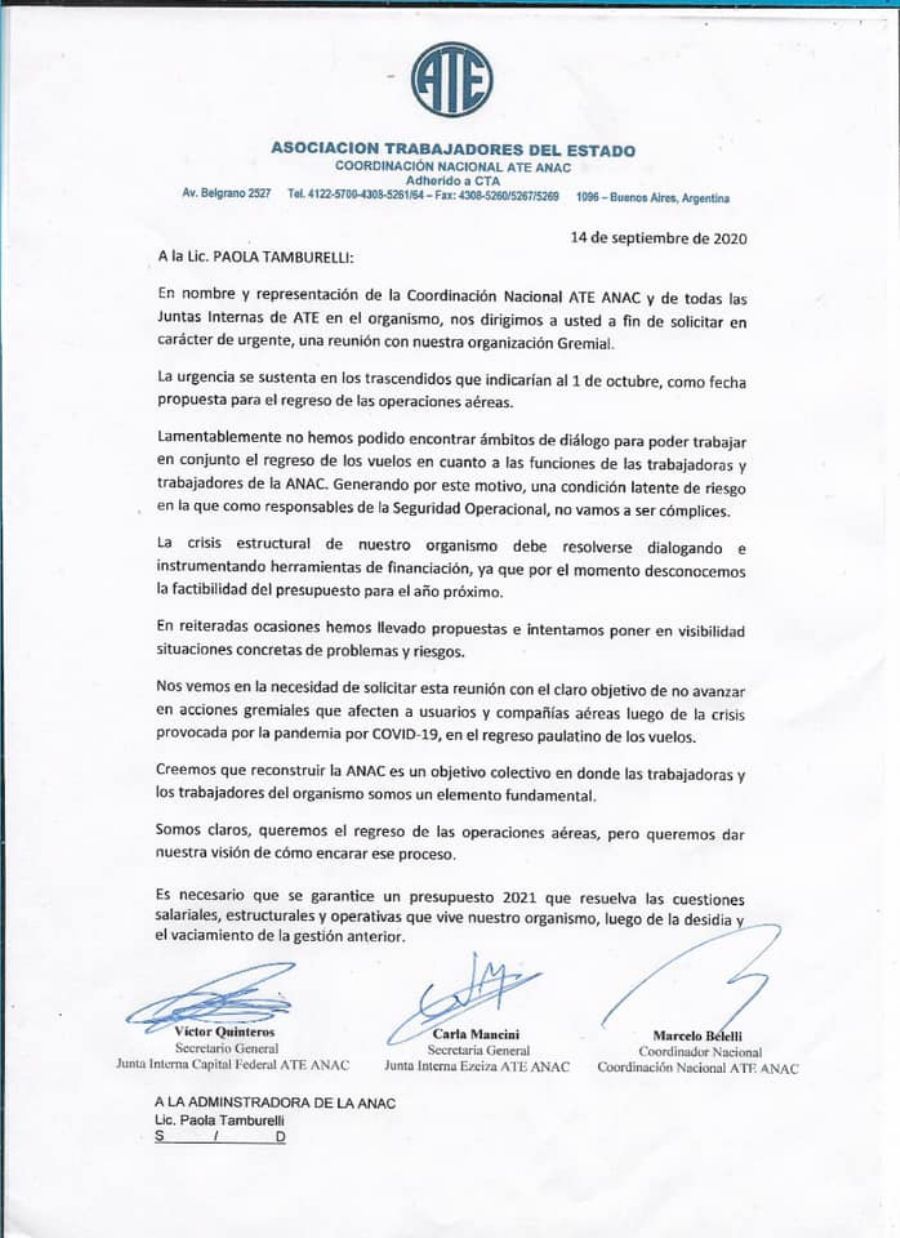 La sectorial ratificó que de haber vuelos, ese mismo 1º de octubre habrá un paro de actividades: “No vamos a exponer a l...