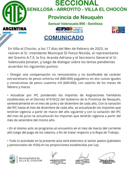ATE y el Intendente Gustavo Suárez acordaron un 60% de aumento para 2023 en dos cuotas: 30% desde el 1° de enero y otro ...