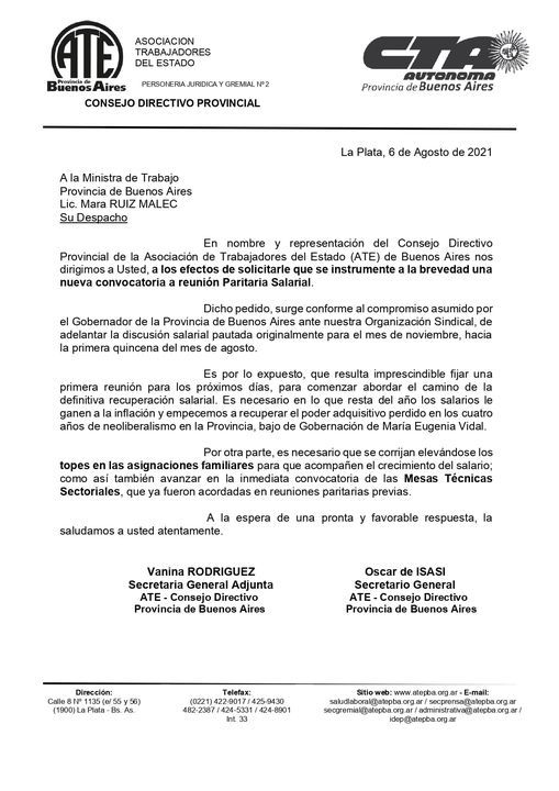 ATE también quiere discutir el pase a planta permanente de agentes, la situación de la carrera profesional en el sector ...