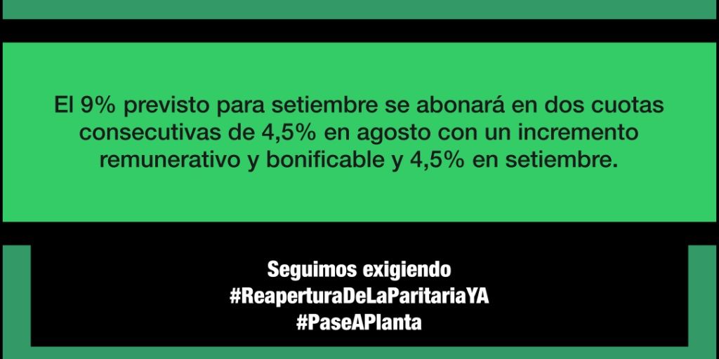 Se trata de un 17% de aumento, ofrecido en 3 cuotas: 10 % con el sueldo de octubre; 5 % con el sueldo de diciembre; y 2 ...