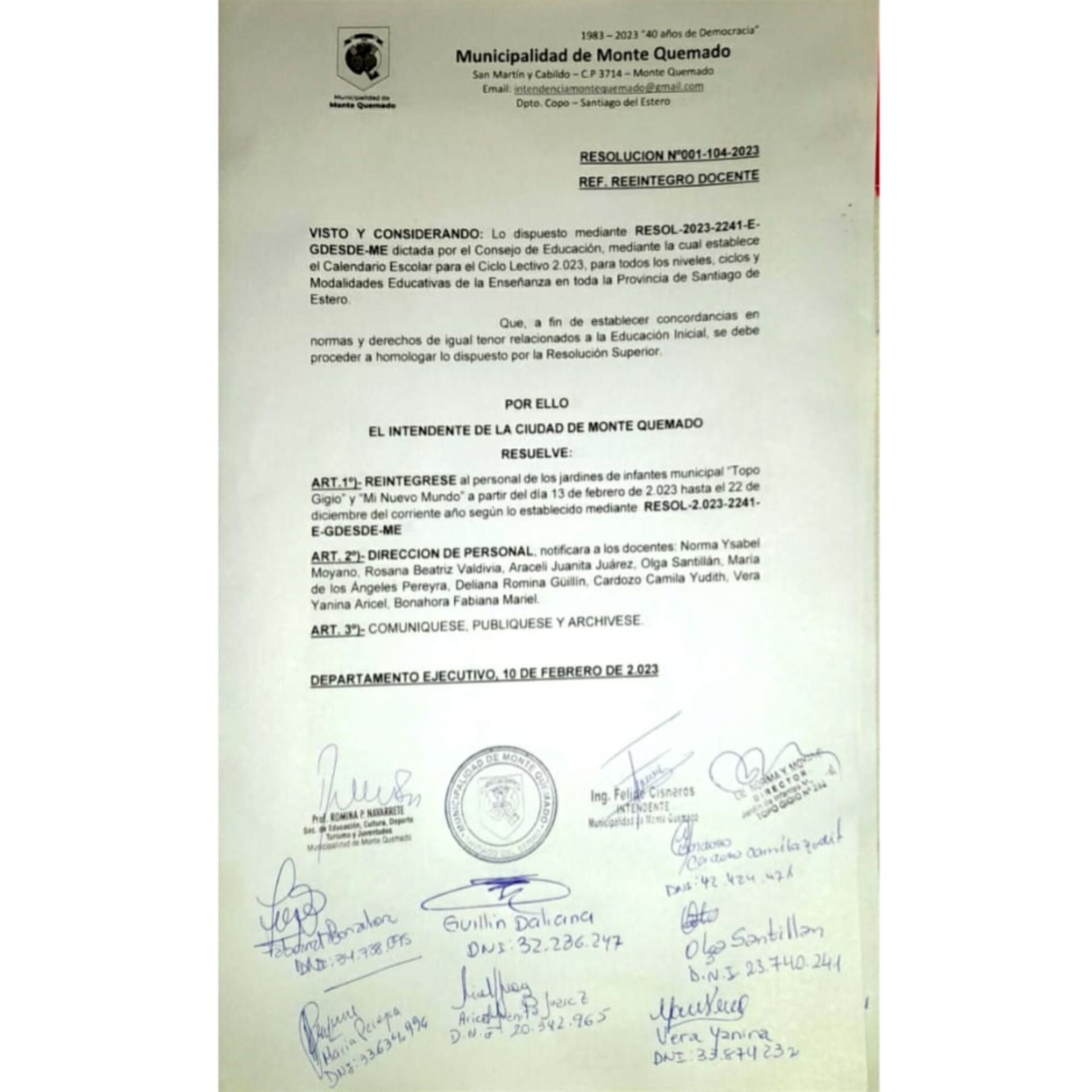 Se reintegran a su cargo tras la sanción de la resolución 104/23.