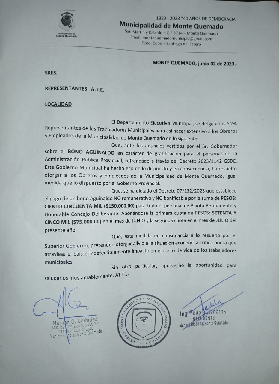 ATE señala que el intendente no ha contestado al pedido del sindicato de sumar a Monte Quemado al aumento salarial de 2...
