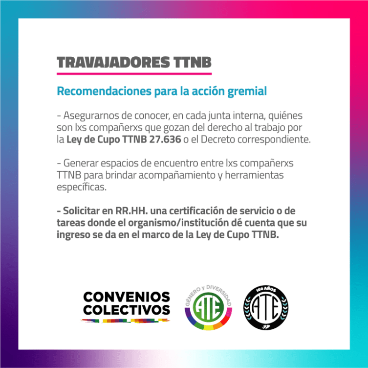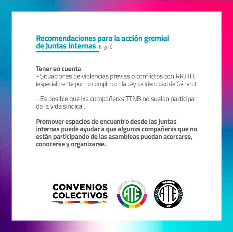 En ese sentido, el Observatorio junto al departamento de Convenios Colectivos y activistas travesti, trans y no binaries presenta a continuación una serie de recomendaciones para la acción gremial de Juntas Internas.